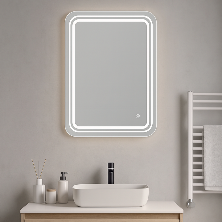 Espejo LUX-001 de 50×60 cm rectangular con luz LED touch. Moderno, decorativo y funcional, ideal para baños y tocadores.