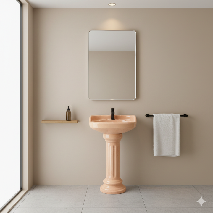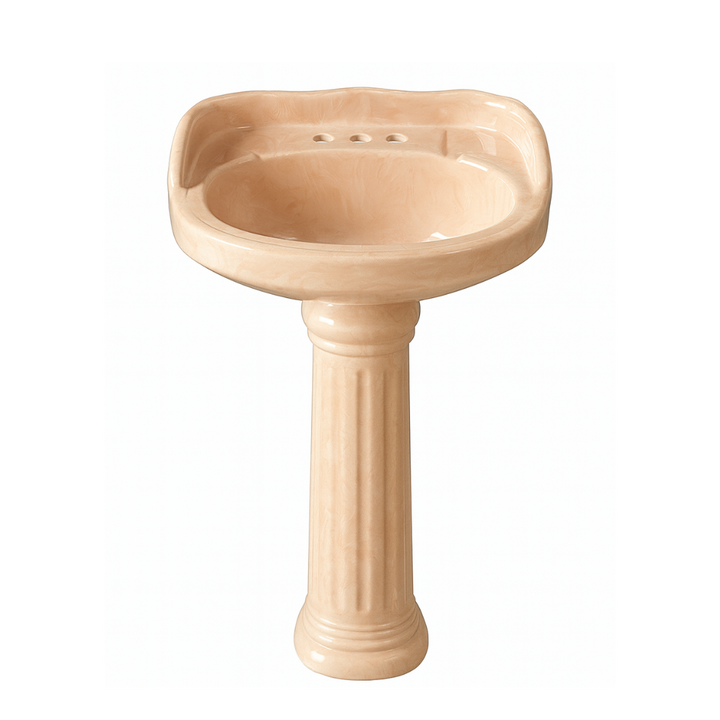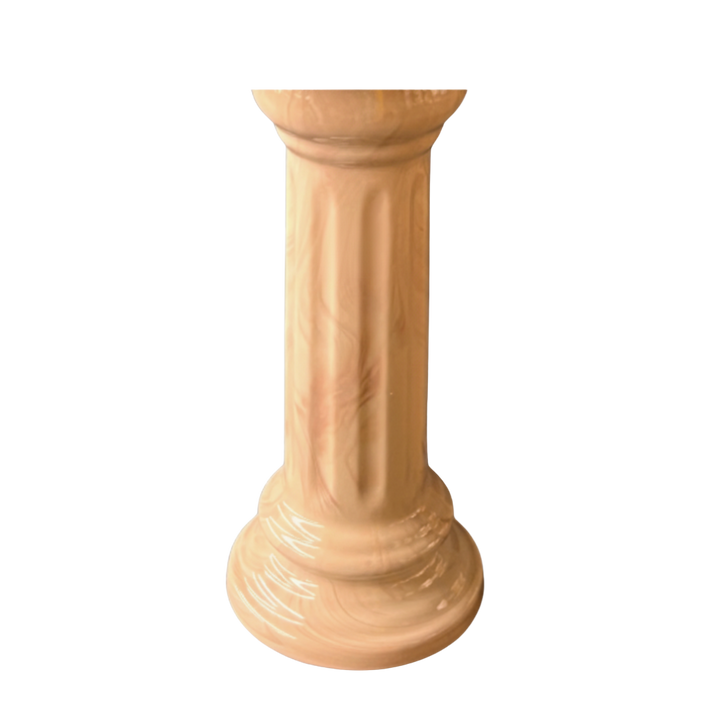 El pedestal, diseñado en una sola pieza, brinda soporte estable y complementa perfectamente la fuente, creando un conjunto armónico y refinado. Este acabado marmoleado en tonos rosados se adapta a proyectos residenciales o comerciales que buscan un diseño original y lleno de personalidad.