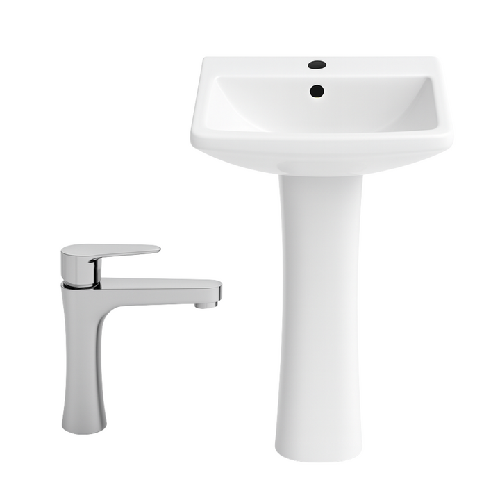 Set completo: lavabo, pedestal y monomando incluidos.