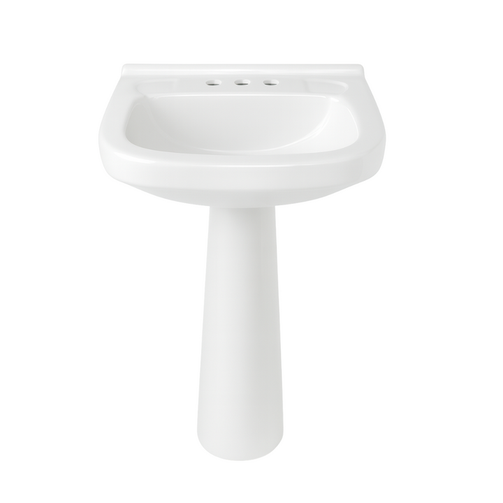 Lavabo y pedestal Kisson Jade/Premier blanco, fabricados en cerámica comercial. Conjunto práctico, resistente y fácil de limpiar, ideal para baños residenciales y comerciales.