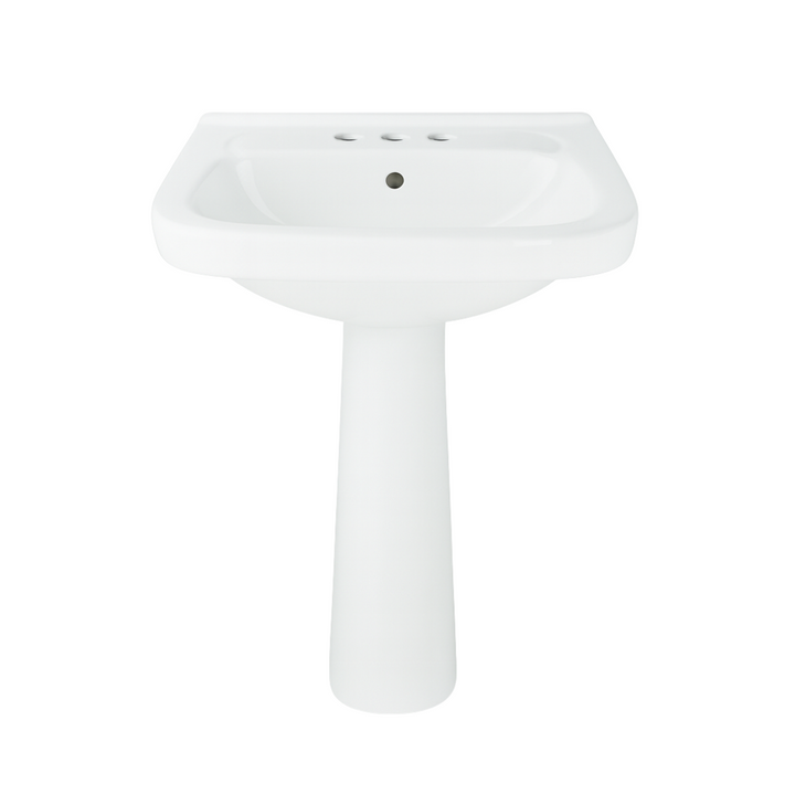 El lavabo, fabricado en cerámica de uso comercial, incluye rebosadero para mayor seguridad y durabilidad. El pedestal, diseñado en una sola pieza, brinda soporte estable y una estética uniforme al conjunto.
