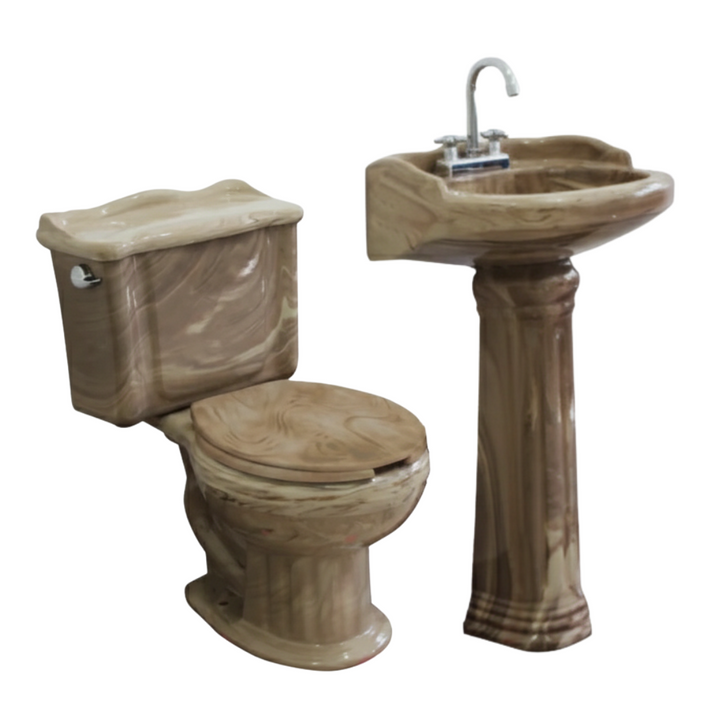 Paquete sanitario Atenas RD. mármol café, fabricado en cerámica de calidad única. Incluye taza, tanque, lavabo y pedestal. No incluye asiento ni grifería.