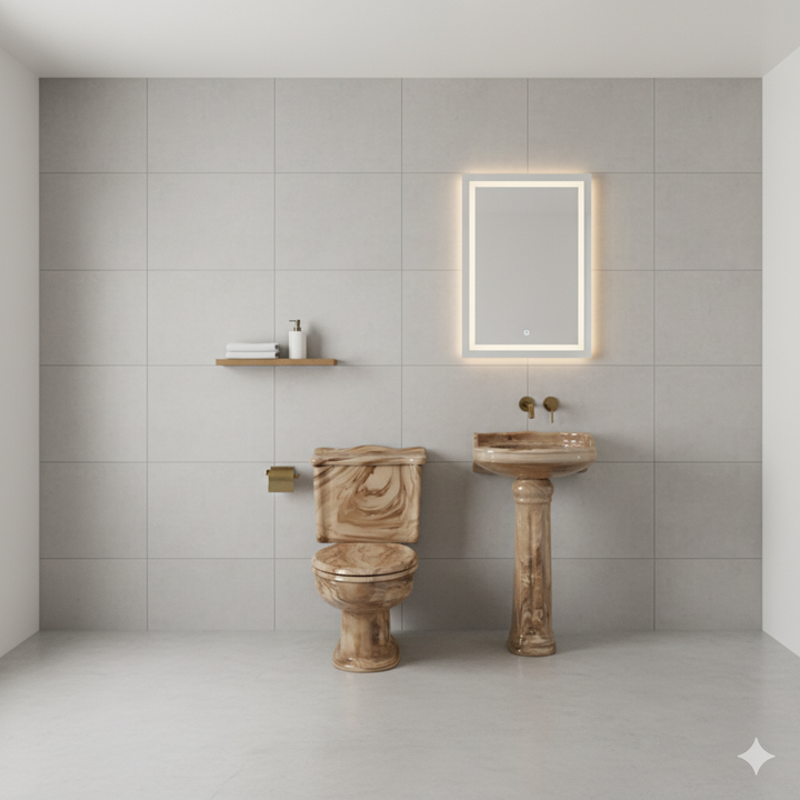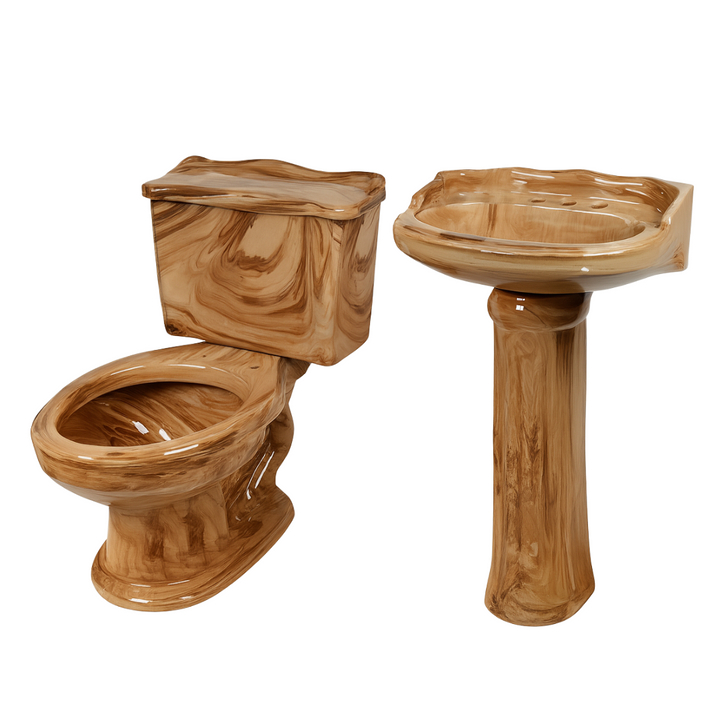 Paquete Ceramosa Atenas/Romano Chico mármol café, fabricado en cerámica de calidad única. Incluye taza, tanque, lavabo y pedestal. No incluye asiento.