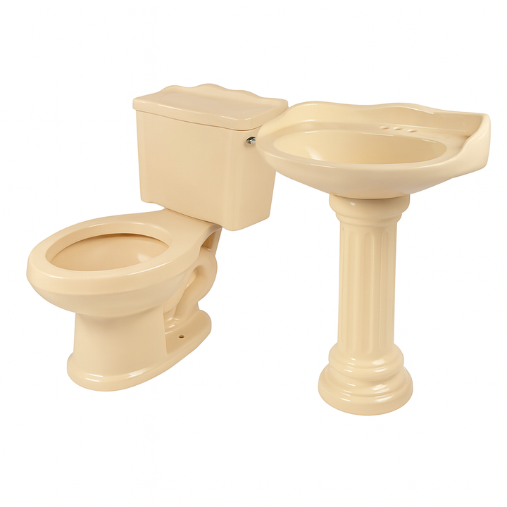 Paquete sanitario Atenas/Romano Grande marfil, fabricado en cerámica de calidad única. Incluye taza, tanque, lavabo y pedestal. No incluye asiento.
