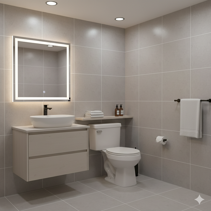 Puedes completar con grifería cromada o blanca para mantener una estética uniforme.