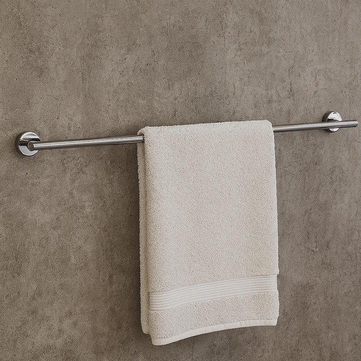 Fabricado en materiales de alta resistencia con recubrimiento cromado brillante, garantiza durabilidad, resistencia a la humedad y fácil limpieza, manteniendo siempre un aspecto impecable. Su formato de barra permite colgar y secar toallas de manera cómoda y accesible.