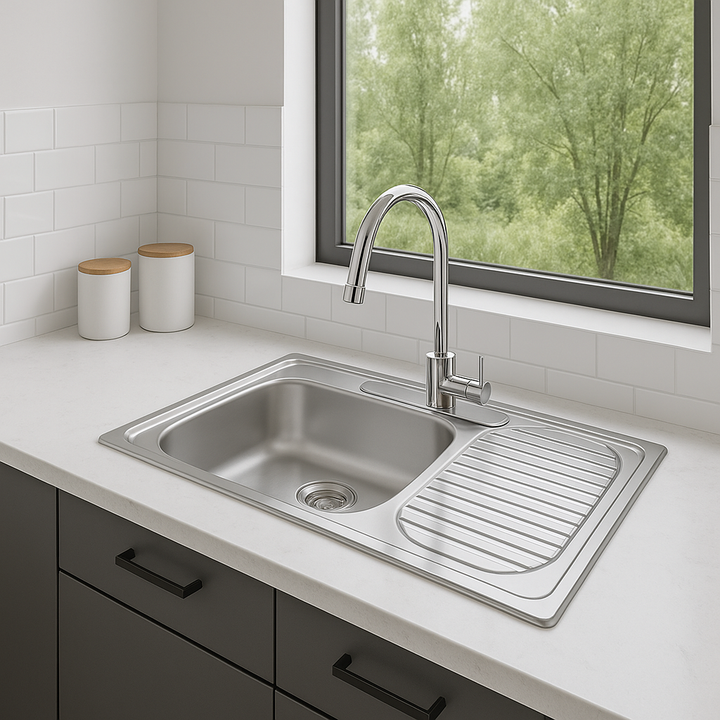 La Tarja Simona 80×50 cm con escurridor derecho es una opción versátil y eficiente para cocinas que requieren funcionalidad en espacios más compactos. Su diseño integra un escurridor lateral derecho, lo que facilita el secado de utensilios, manteniendo la superficie limpia y organizada.