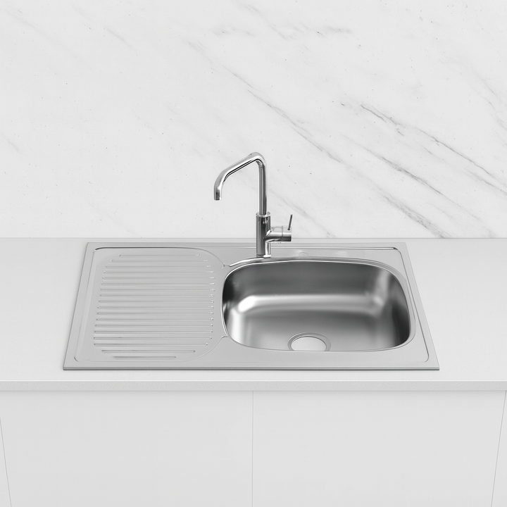 Tarja Simona 80×50 cm con escurridor izquierdo. Compacta, práctica y resistente, fabricada en acero inoxidable para cocinas modernas y funcionales.
